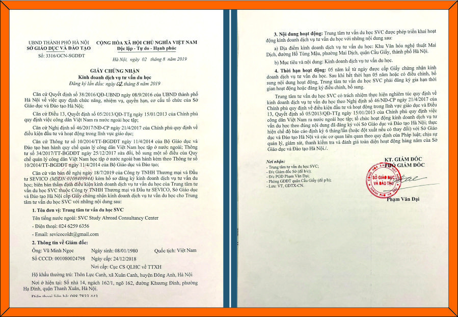 SVC được sở kế hoạch và đầu tư thành phố Hà Nội cấp phép hoạt động trong lĩnh vực hỗ trợ giáo dục theo giấy phép kinh doanh 0108409944 đầy đủ, đảm bảo sự uy tín và hợp pháp, Bên cạnh đó chúng tôi sở hữu mạng lưới đối tác toàn cầu và liên kết với các trường đại học, cao đẳng nổi tiếng tại Hàn Quốc và Nhật Bản